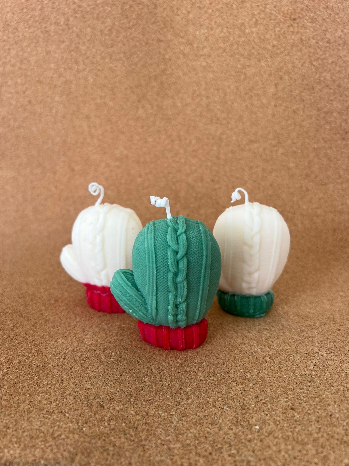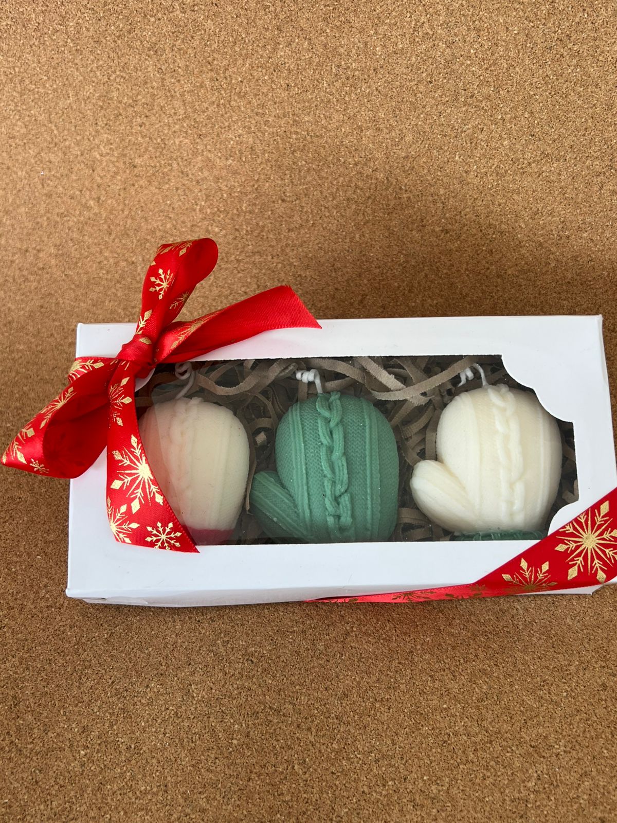 3 guantes multicolor en cera de soya de aprox 70gr, con fragancia navideña